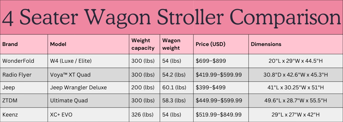 Here is a chart I made to help compare the other wagons I looked at, that way you can get an idea of what would work for your little ones.