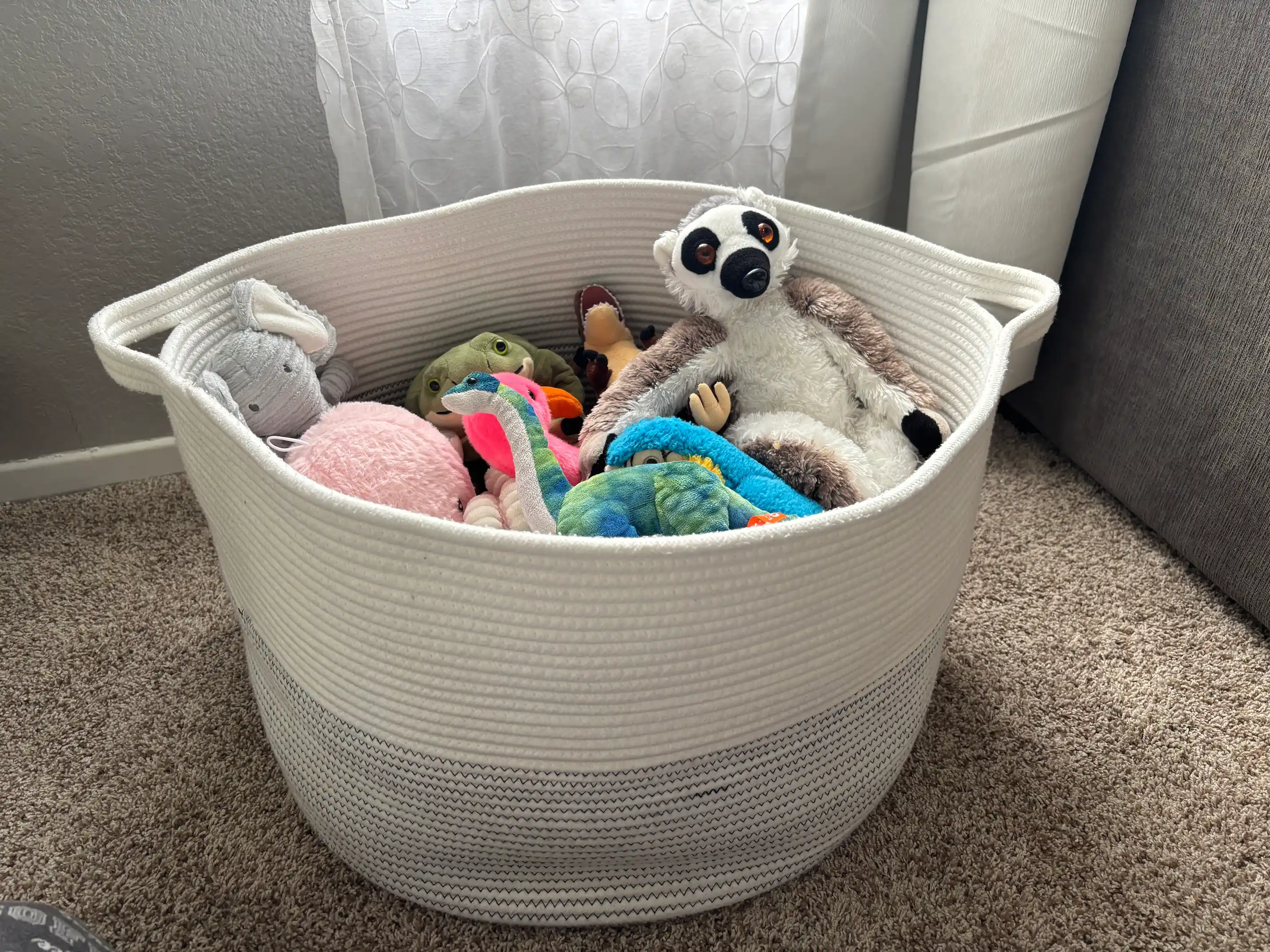 - Toys from the rope basket go back in the rope basket