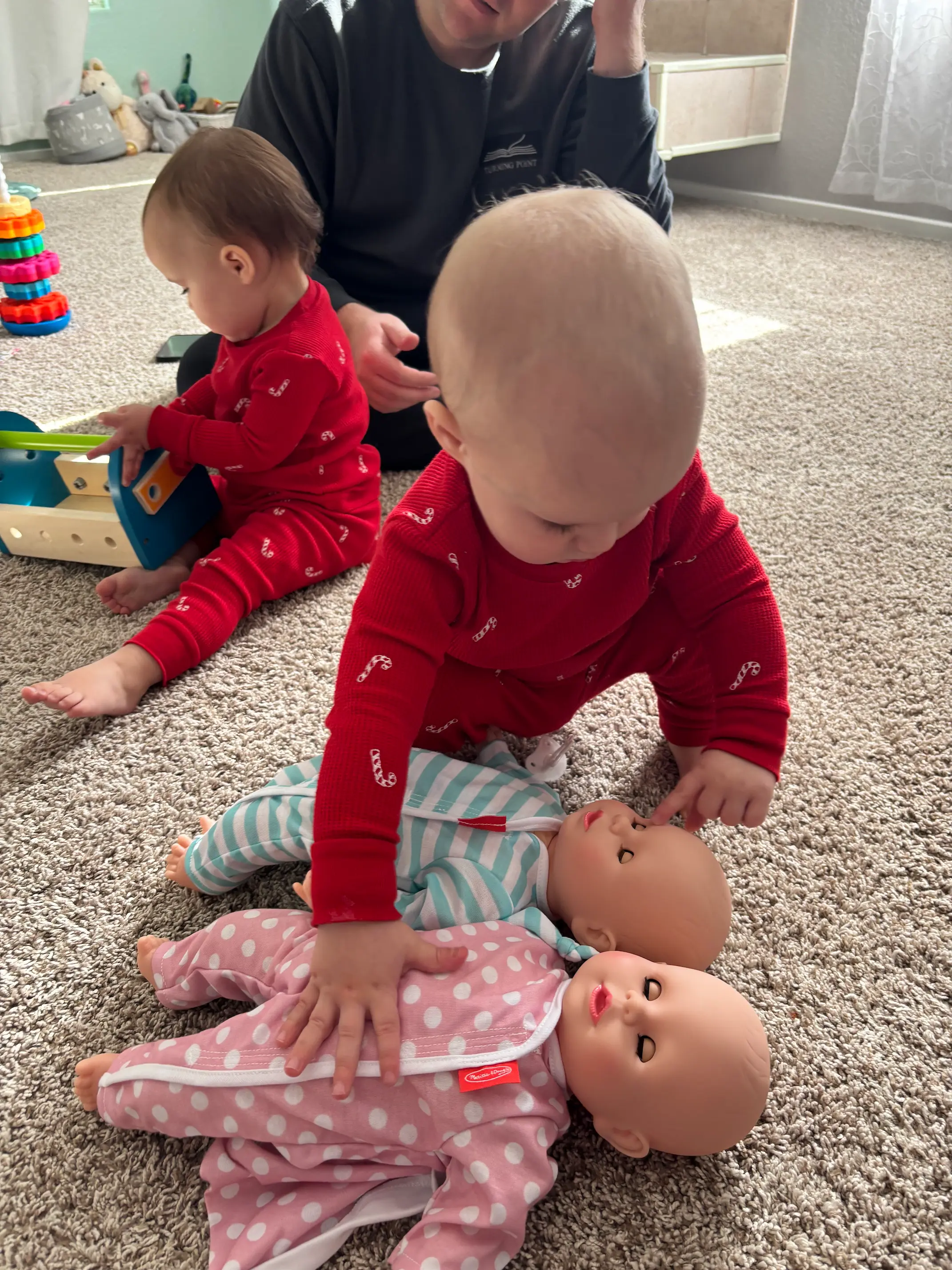 Our son loves knocking toys over, but since the toys are wooden, they make a lot of noise when they fall on the floor. This is a good coaching opportunity for me to teach him how to be gentle with toys. I enjoy being able to teach them simple lessons through play, and seeing them act out these lessons. For instance, I see how both our twins (boy and girl) are kind and caring towards their Melissa and Doug baby dolls.